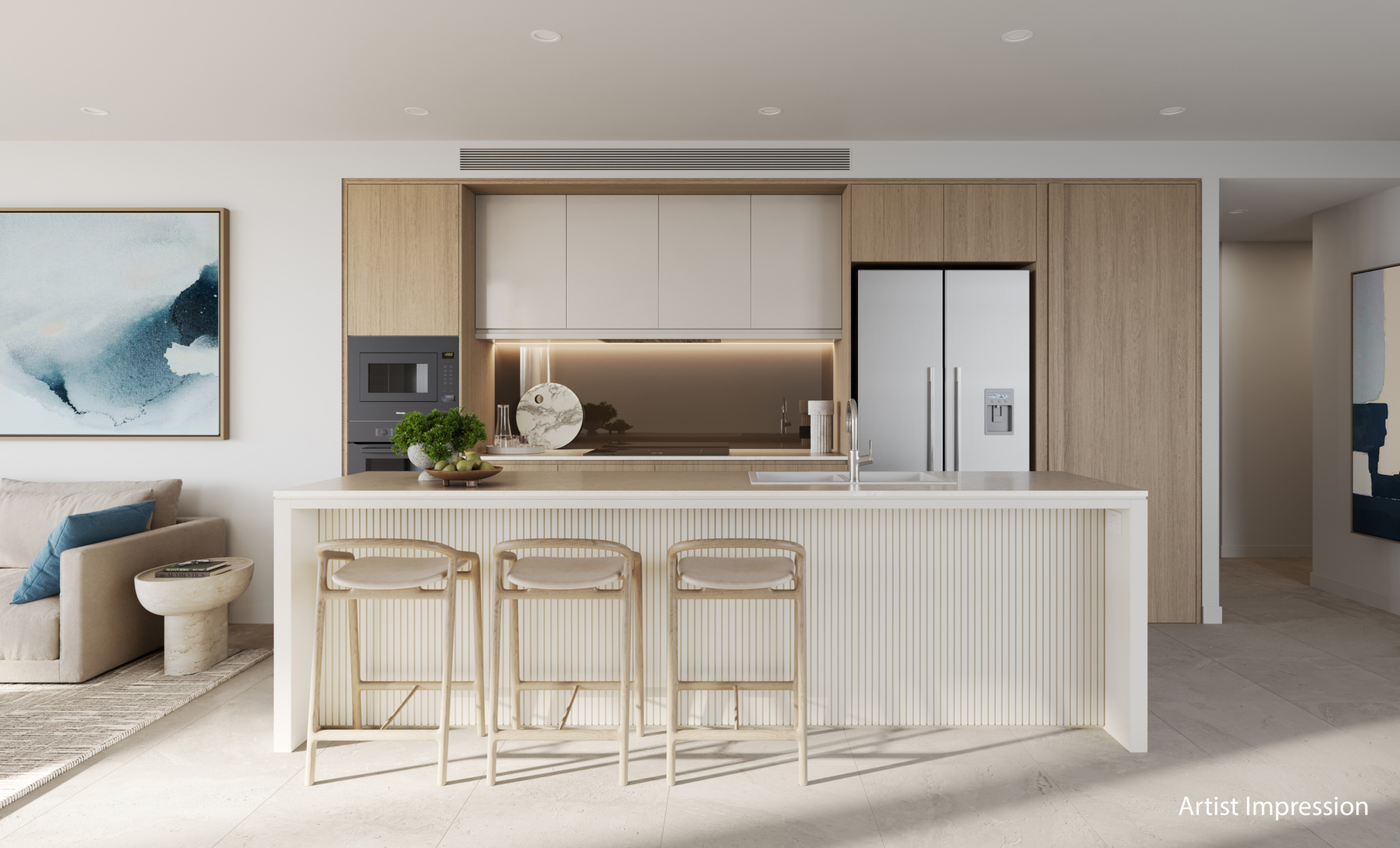 • Open-plan kitchen, living and dining, flowing effortlessly to a private balcony